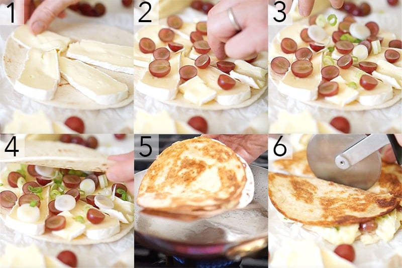 - Add brie slices, onions and grapes to two tortillas. Transfer to the pan and cover with a lid.