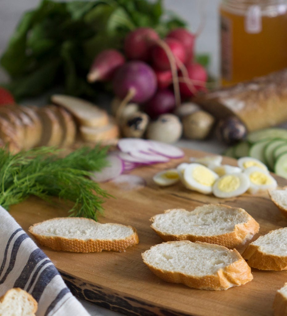 If you want to make the canapés in advance your best bet is to do all the prep work earlier in the day and store the toppings in sealed containers. Slice the radishes, boil and cut the eggs, wash and prep all your fruits and herbs, etc. Just before you’re ready to serve you can easily assemble the canapés in a few moments.