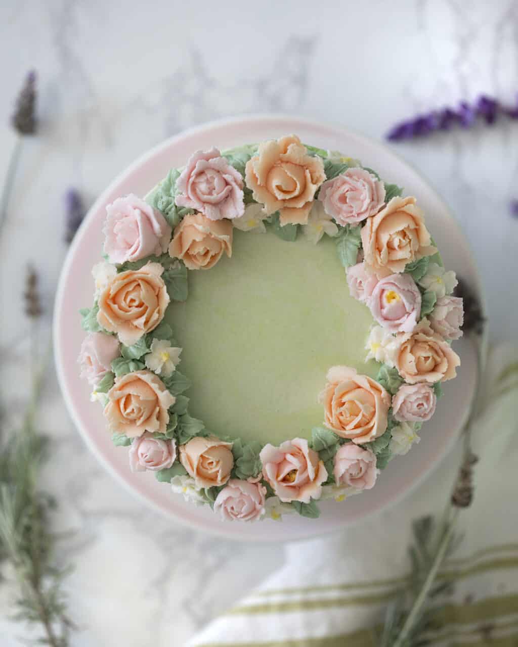 - Dye a small amount of buttercream green for a ring, which will be the base of your flower wreath.