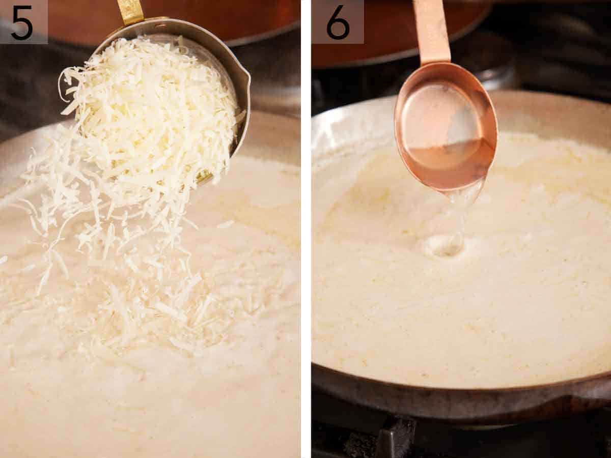 5. Gradually whisk grated parmesan cheese into the cream sauce in the skillet until well combined.